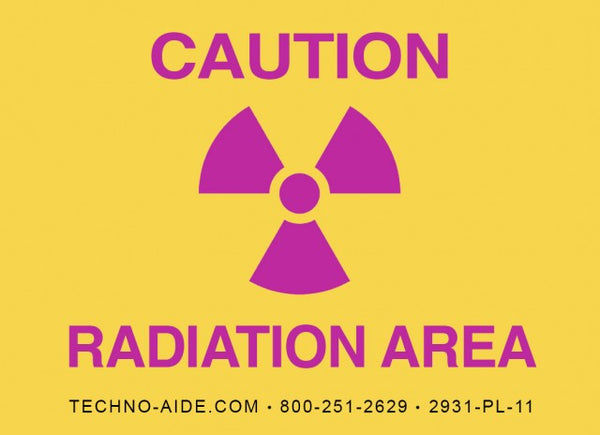 This large 10" x 7" sign distinctly displays both "Caution Radiation" and the universal warning symbol for ionizing radiation present. Designed to meet general x-ray/imaging room standards and compliance, the deep magenta writing stands out clearly against the bright yellow background.